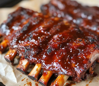 Sweet Ribs. De zoete ribs worden extra op smaak gebracht met een heerlijke lak van donker rode BBQ saus die zwaar aan de honing heeft gezeten.